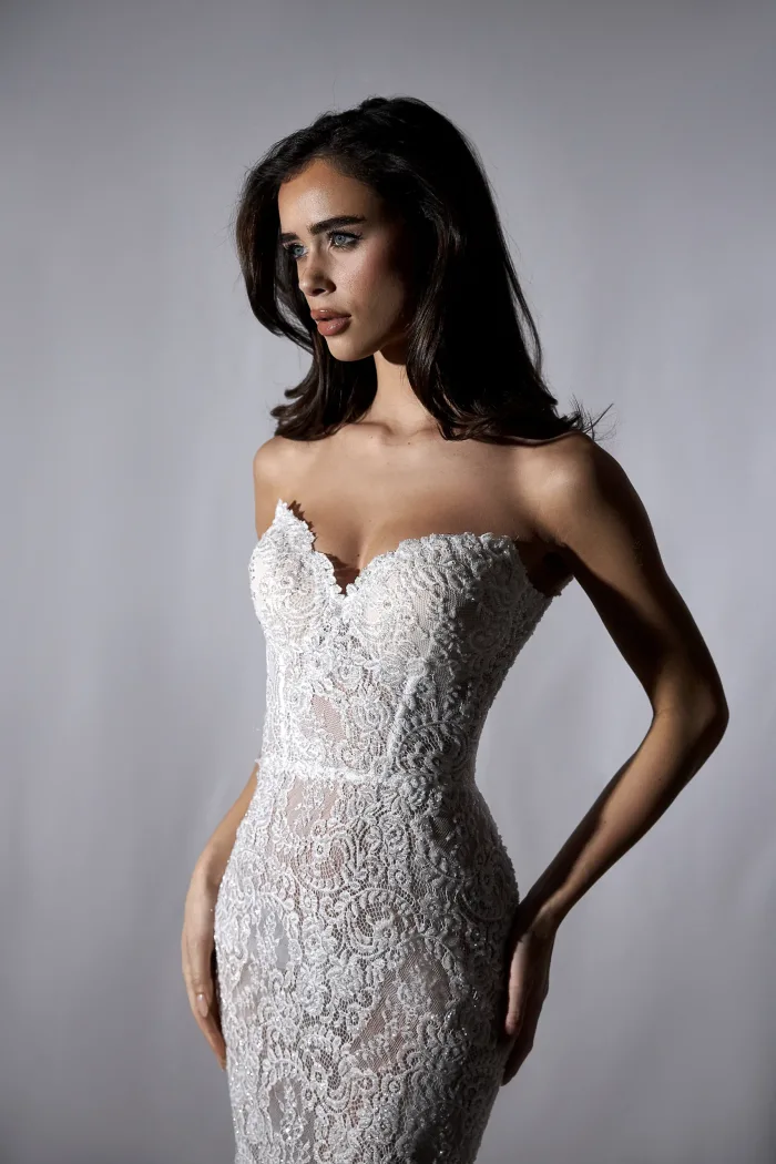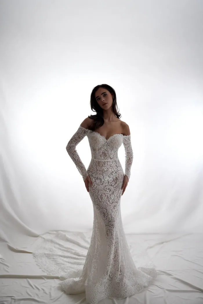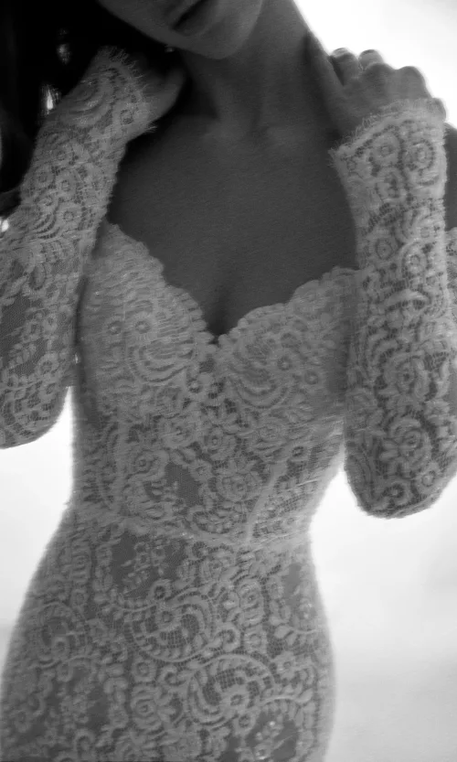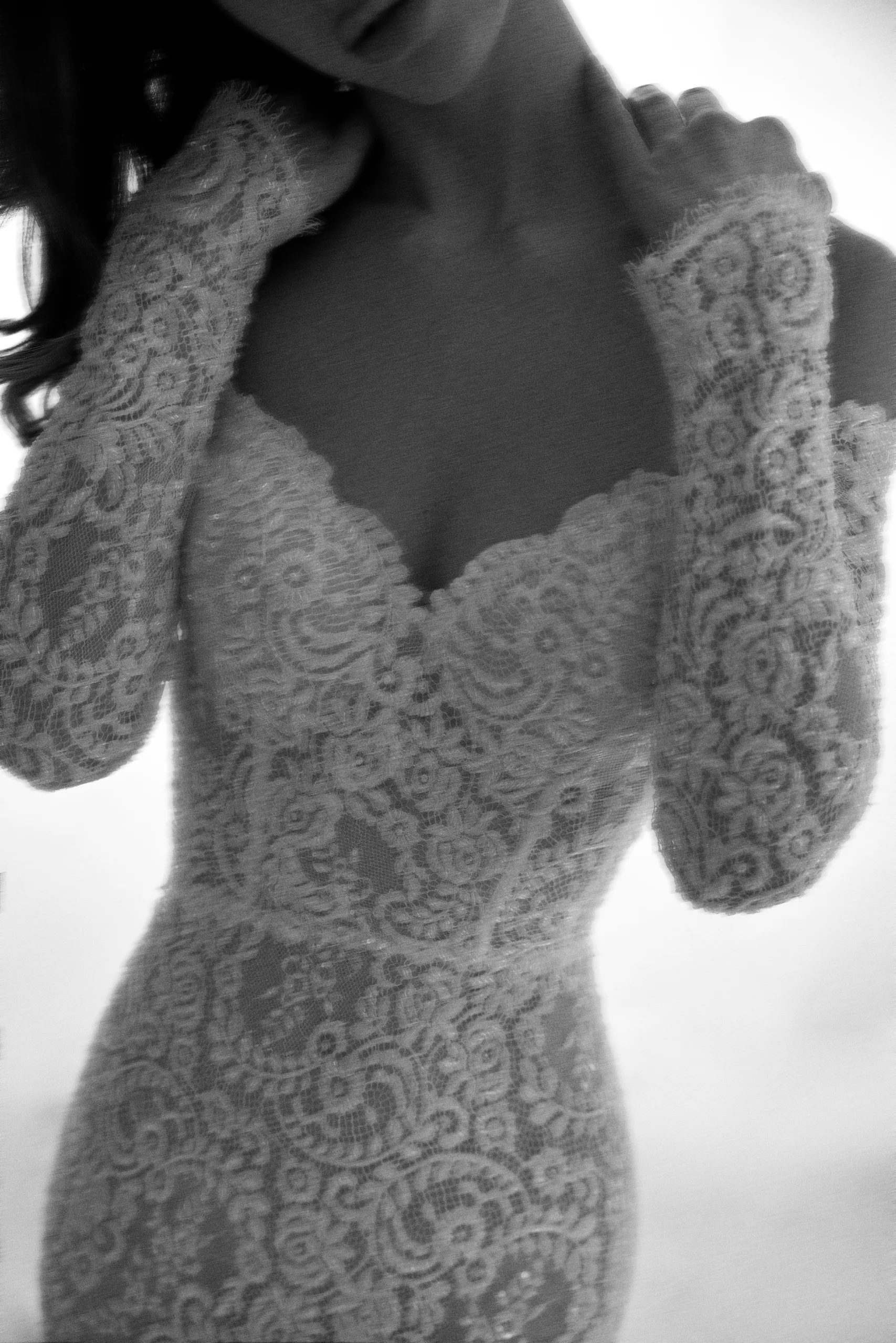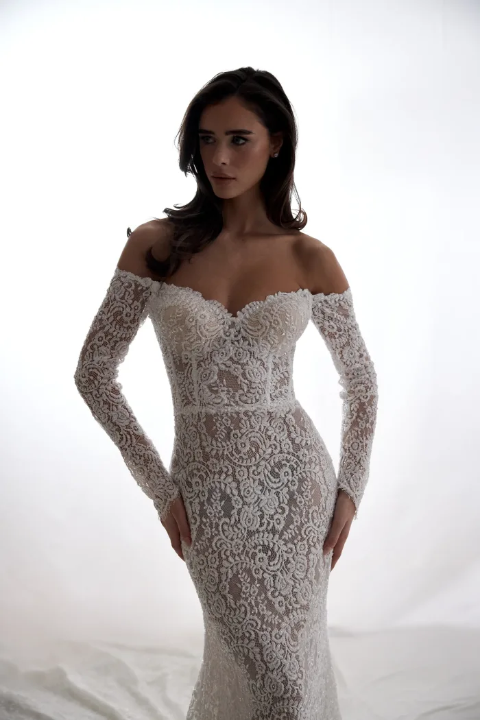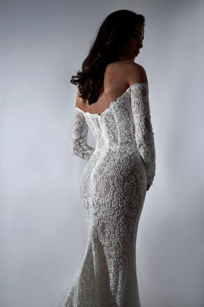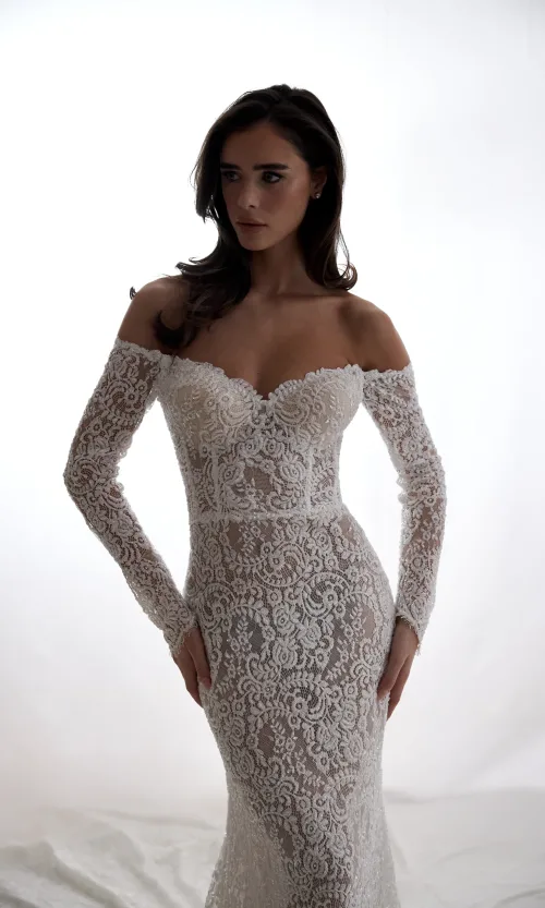 Abito a sirena interamente in pizzo ricamato, arricchito da manicotti coordinati con smerlo al polso, removibili