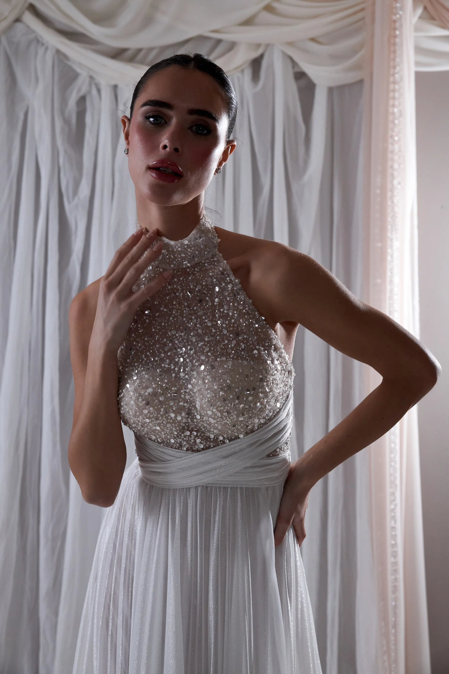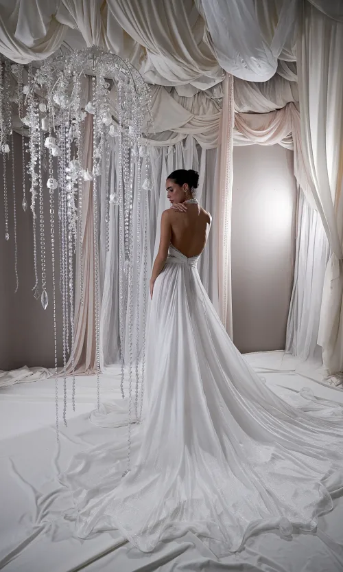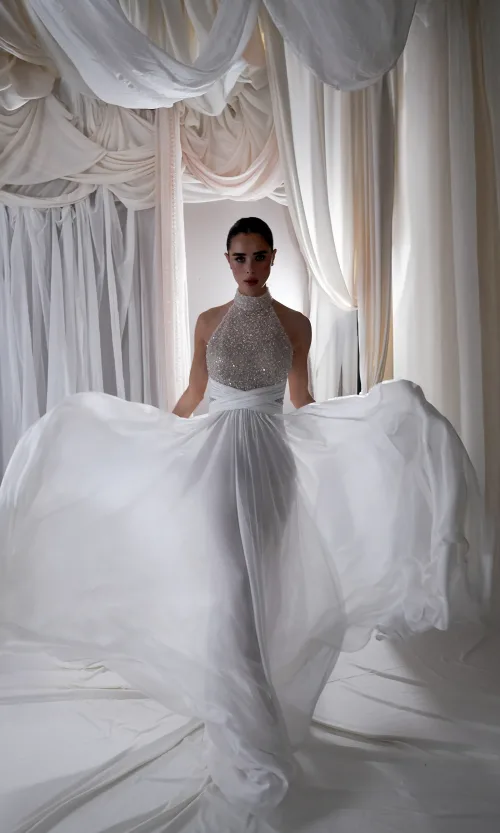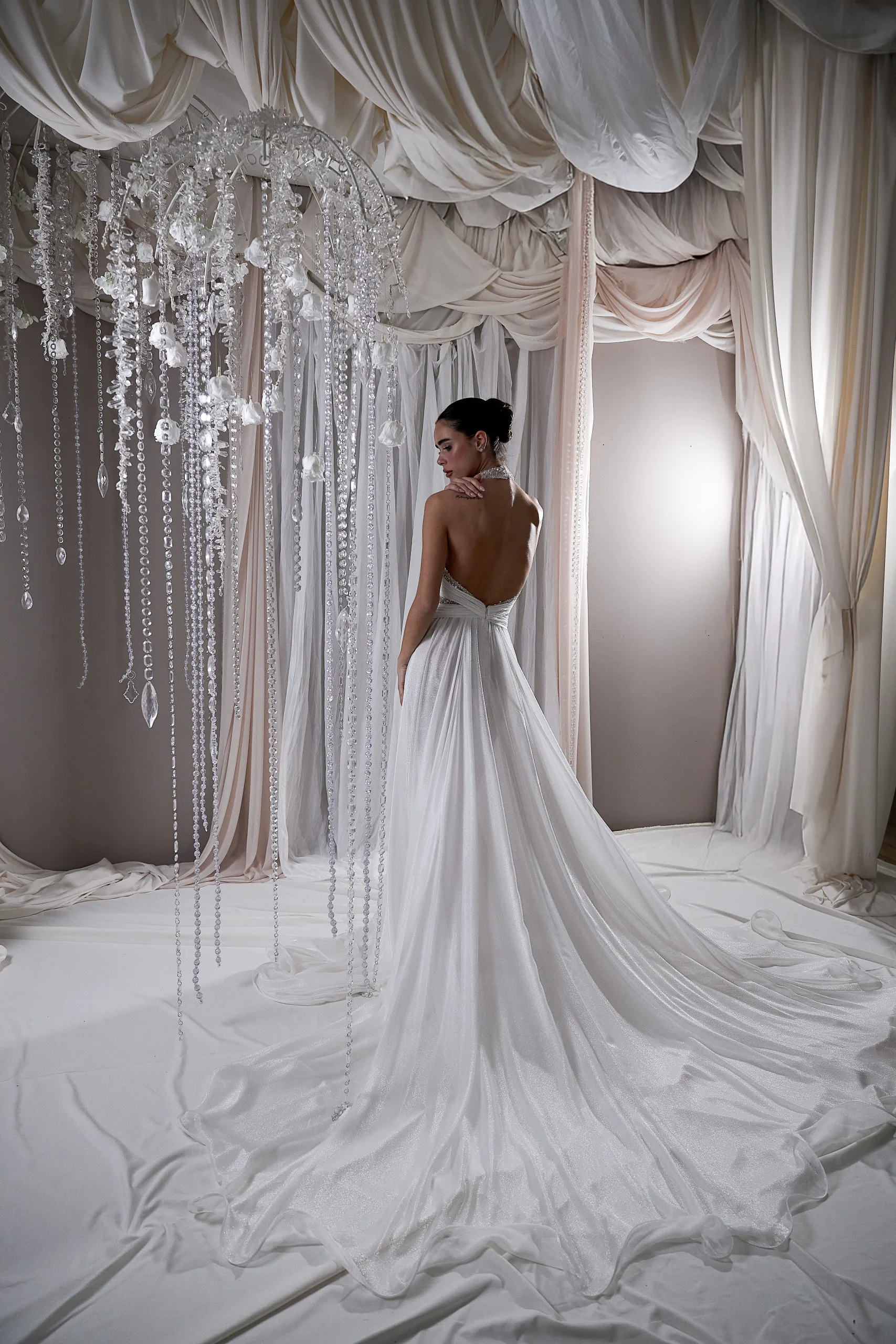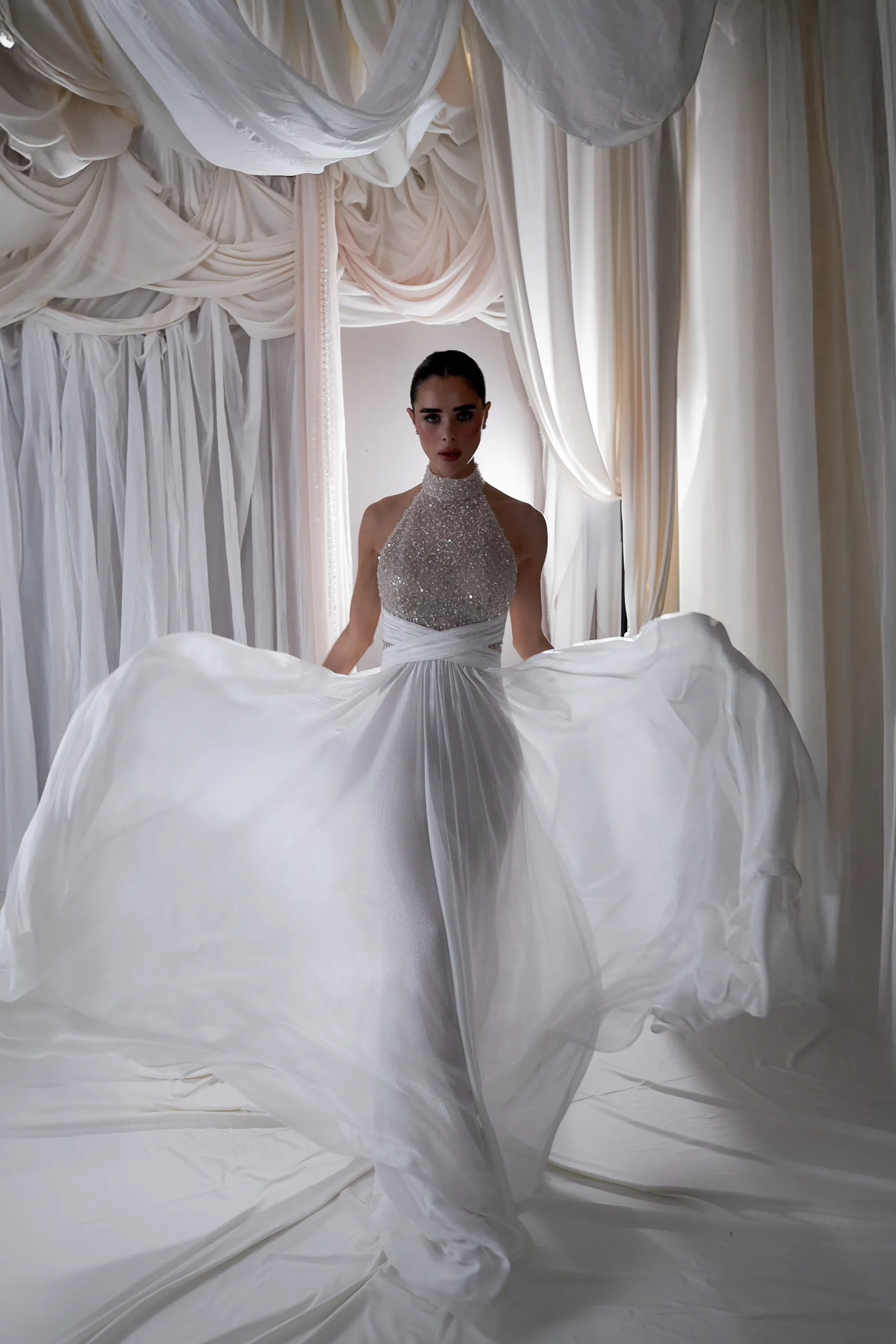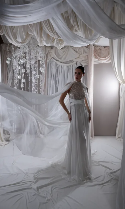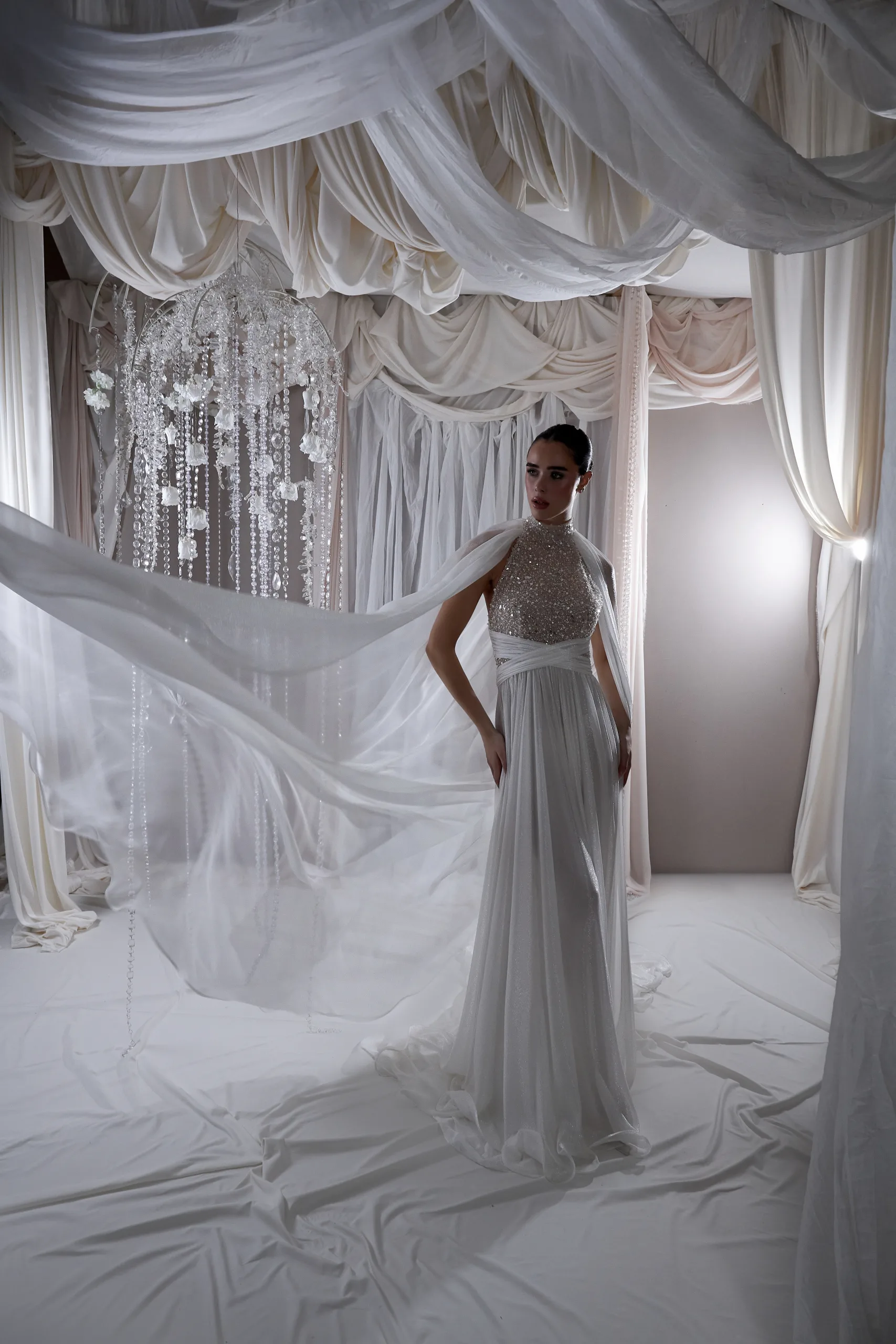 Abito in georgette lurex (74% SETA). Gonna morbida e corpino all’americana in tessuto ricamato. Incrocio drappeggiato a vita in georgette lurex, con cappa staccabile in georgette lurex (74% SETA