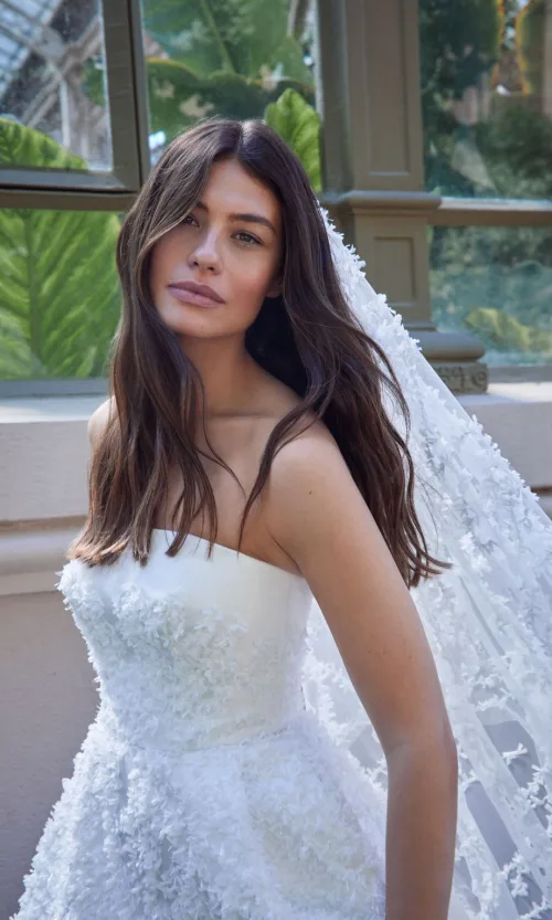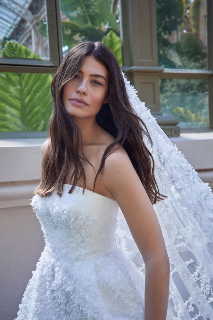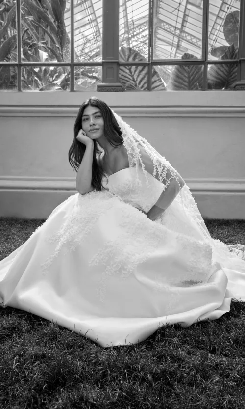 Abito senza spalline molto vaporoso realizzato in mikado di seta e cotone, e ricamo Cornelycon filo a fantasia in cellulosa e lurex. Posizionamento asimmetrico del ricamo. Struttura interiore di sostegno e velo coordinato.