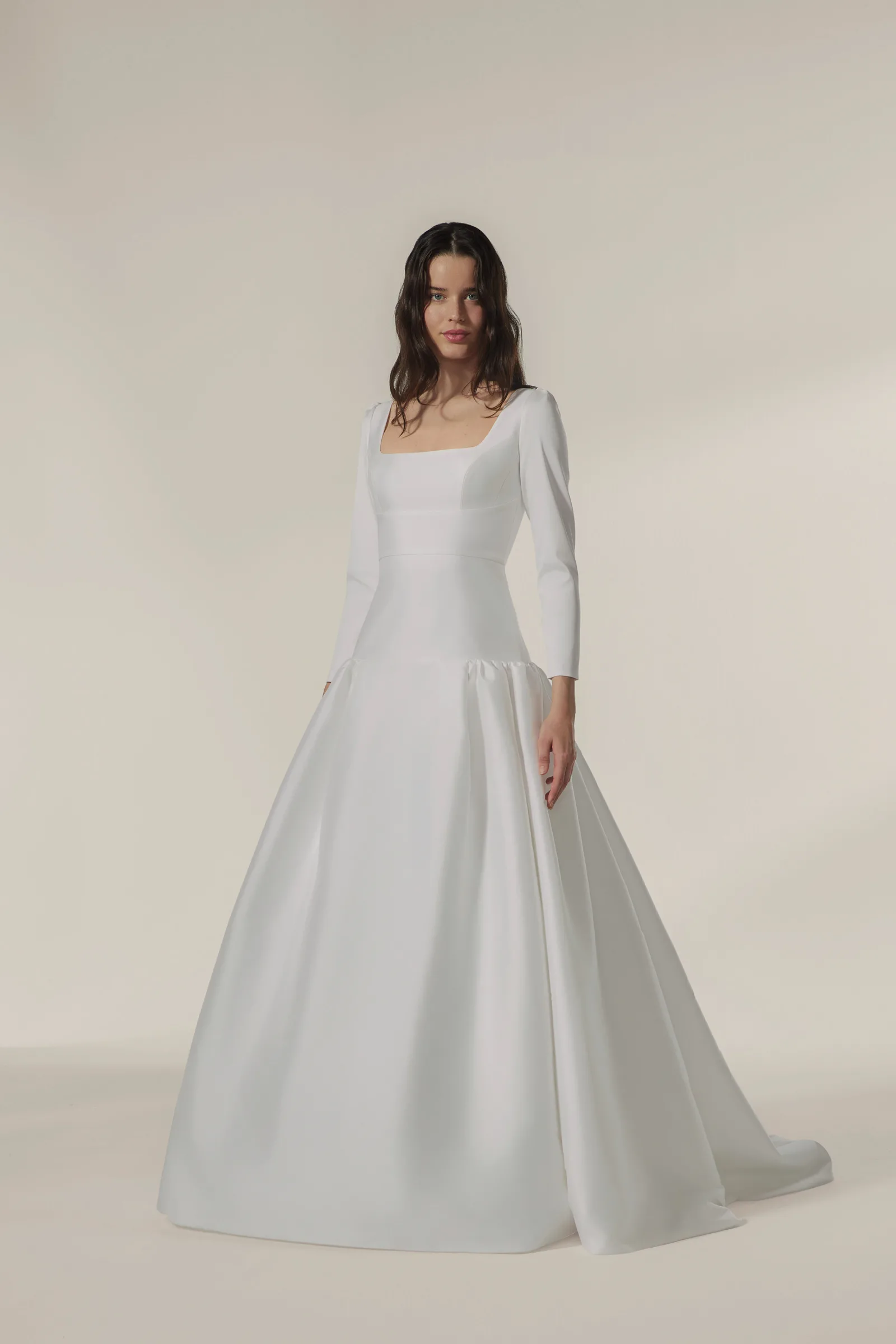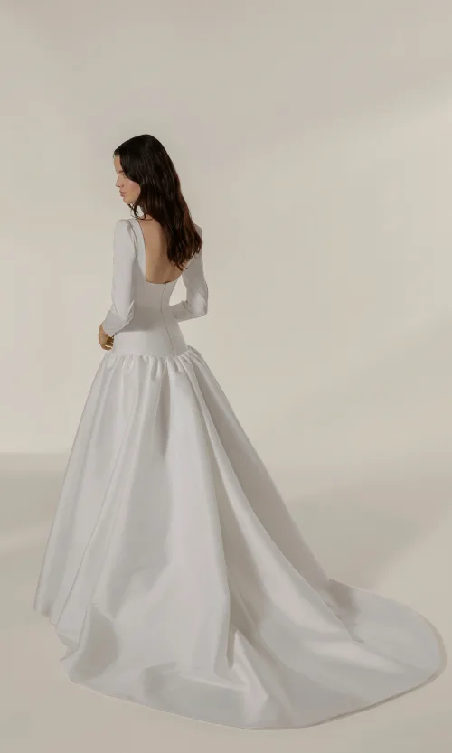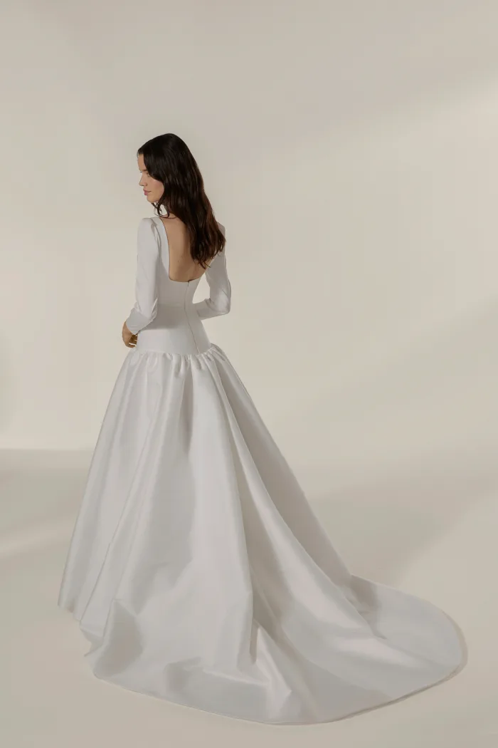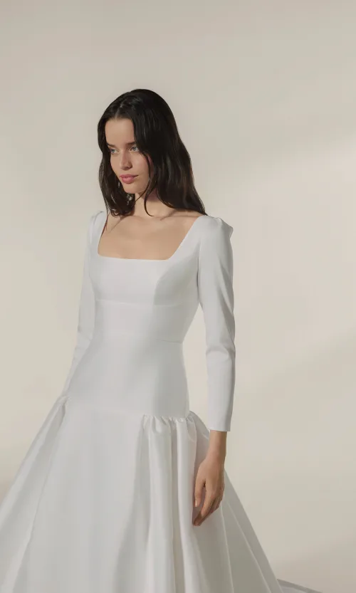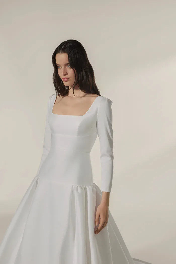 Grande volume a vita bassa con manica 3/4 e scollatura quadrata in mikado elasticizzato.