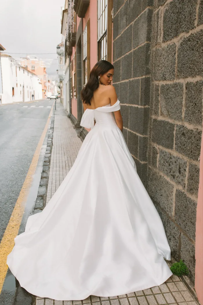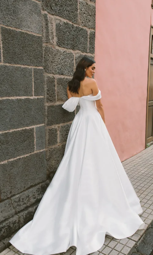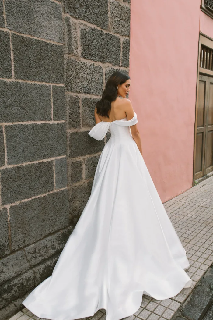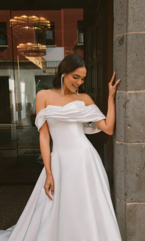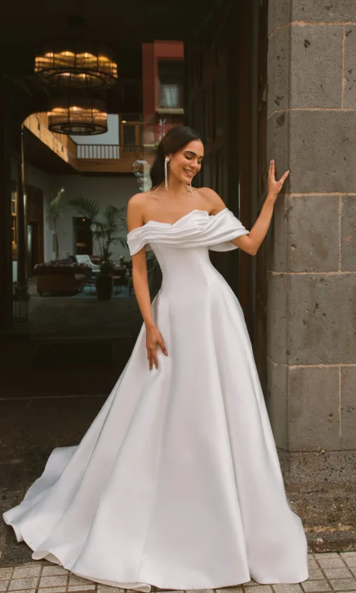 A-silhouette wedding dress with an internal bracing corset. The upper part of the corset fastener is an open lacing. An inner layered skirt is attached to the lower edge of the corset, which supports the upper dress.