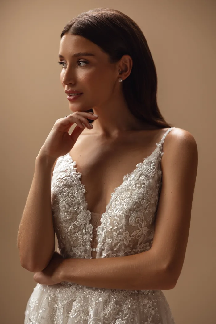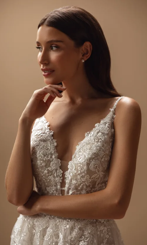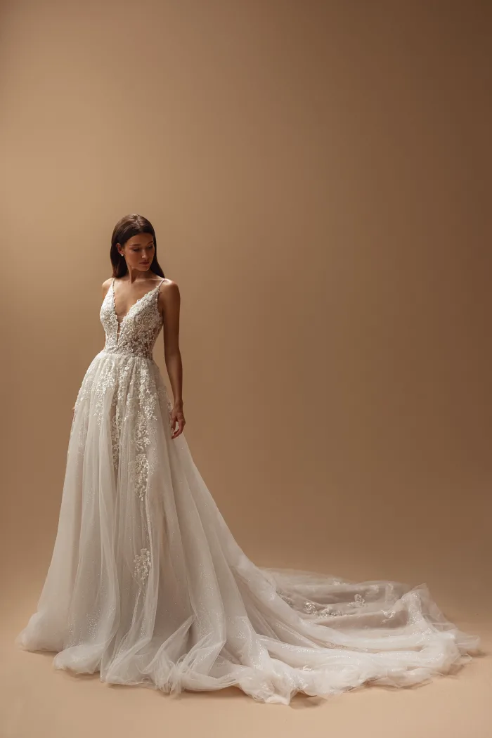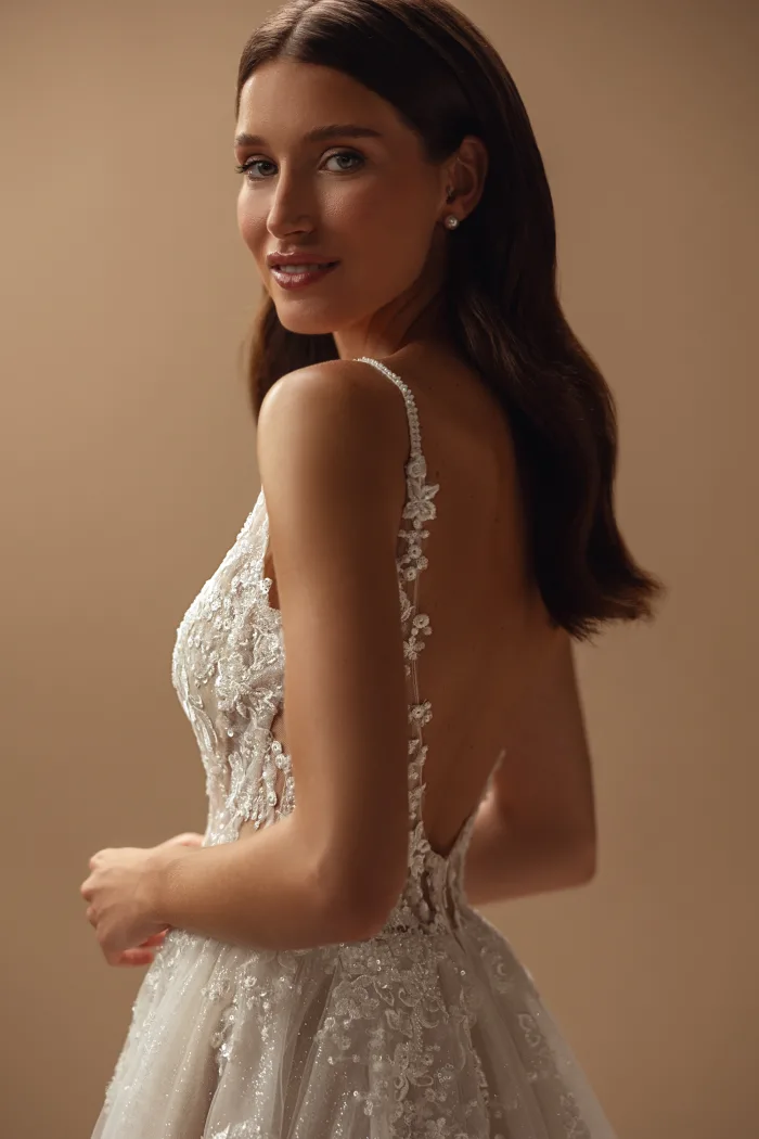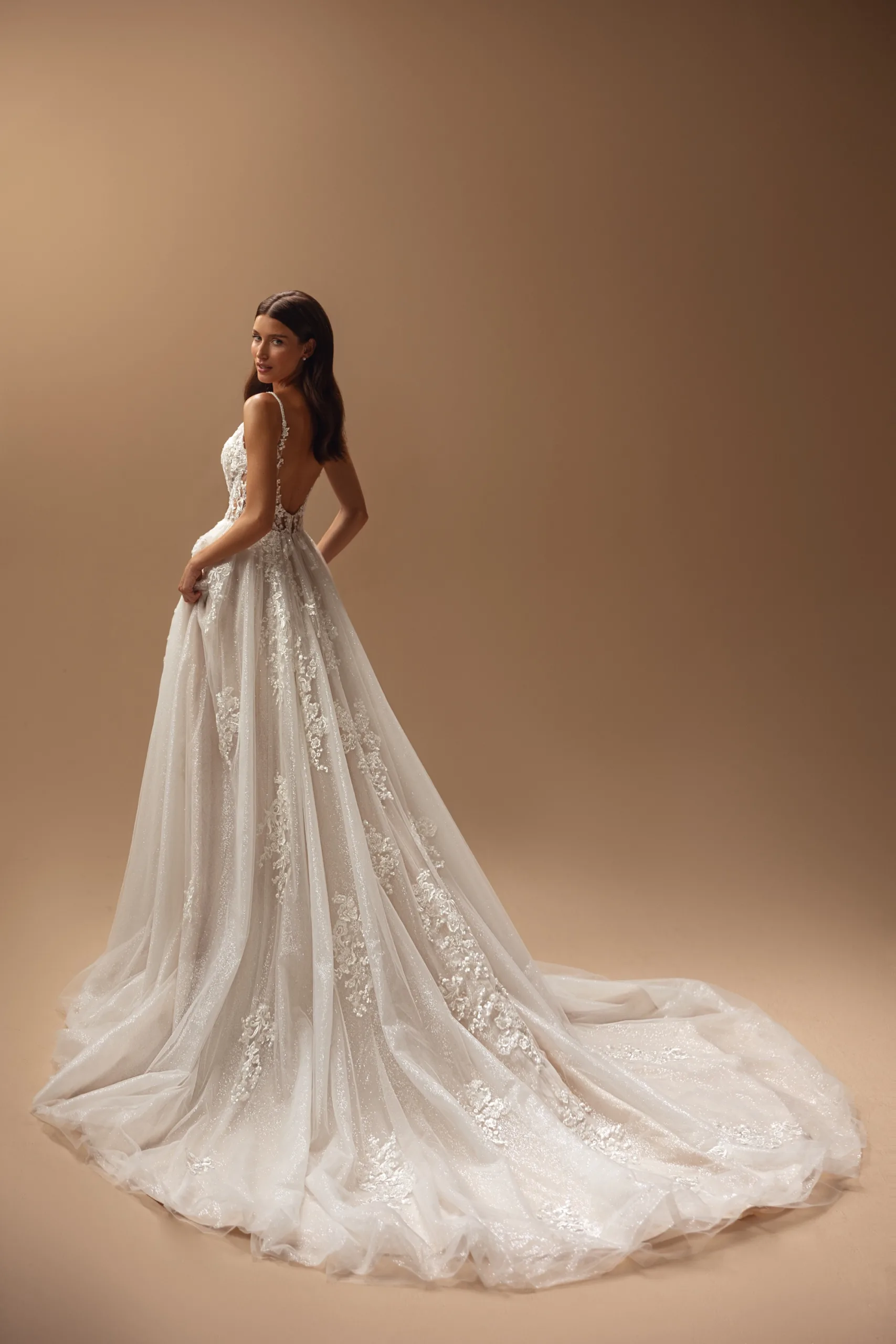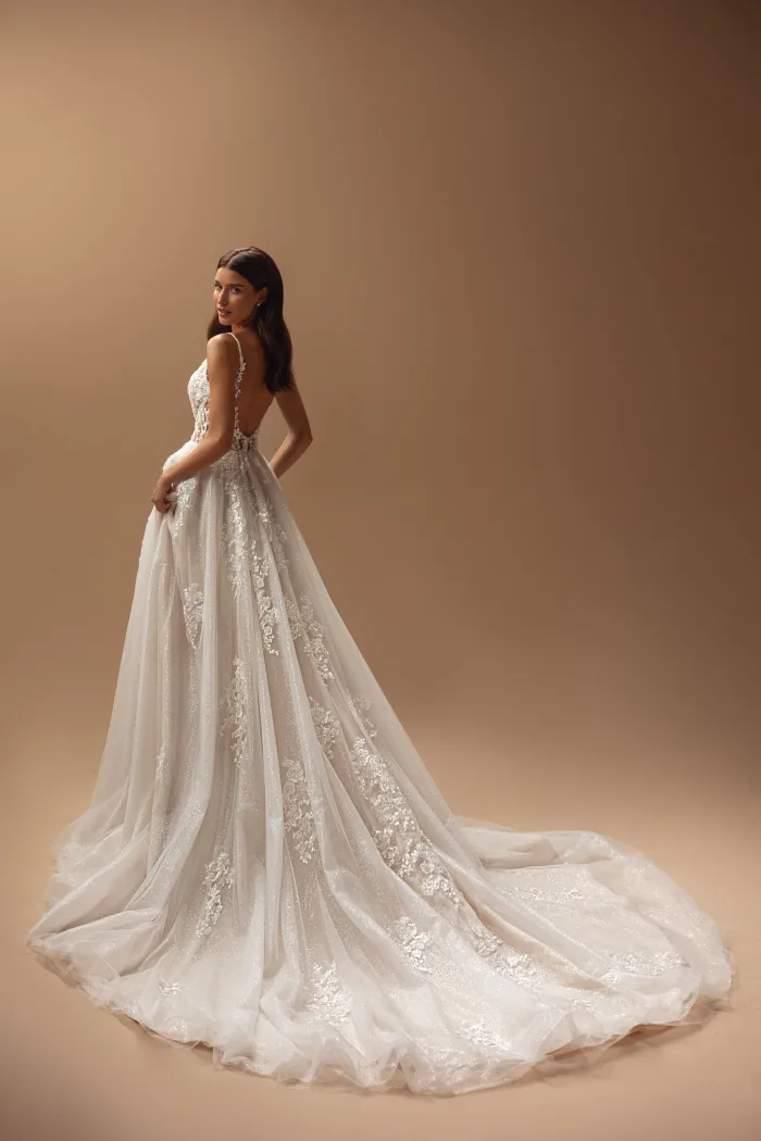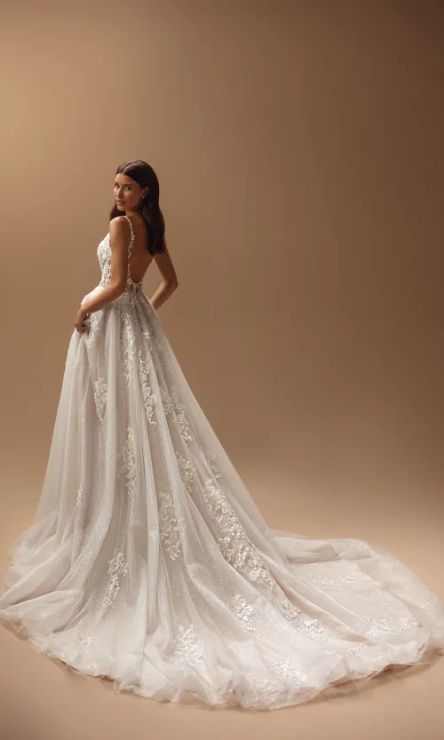 This cappuccino tulle gown showcases an extraordinary back, delicately adorned straps, and a lush, sweeping train. Its V-shaped neckline sparkles with intricate embellishments in a design that feels both otherworldly and timelessly captivating.